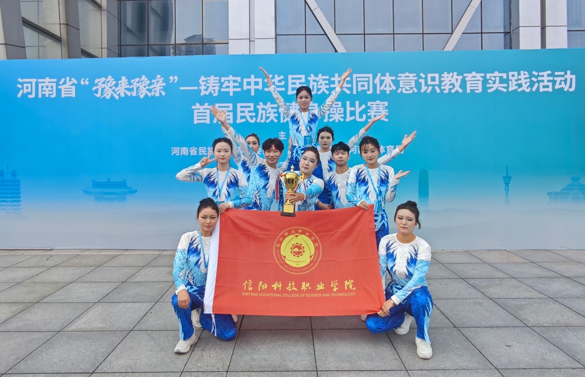 近日,在刚刚落幕的“豫来豫亲”--铸牢中华民族共同体意识教育实践活动首届民族健身操比赛中,由我校罗贺、曾欢欢、杨东老师担任教练,裴振翔老师担任领队,李欣桐、陈雅静等十一名同学组成的代表队团结拼搏,最终荣获三等奖。成功的背后是辛勤的汗水与不懈的坚持。自组队以来,罗贺、曾欢欢、杨东三位教练员老师便投入了大量心血,他们利用课余和休息时间,精心编排动作,细致指导每一位队员。训练场上,他们不厌其烦地示范、纠正,...