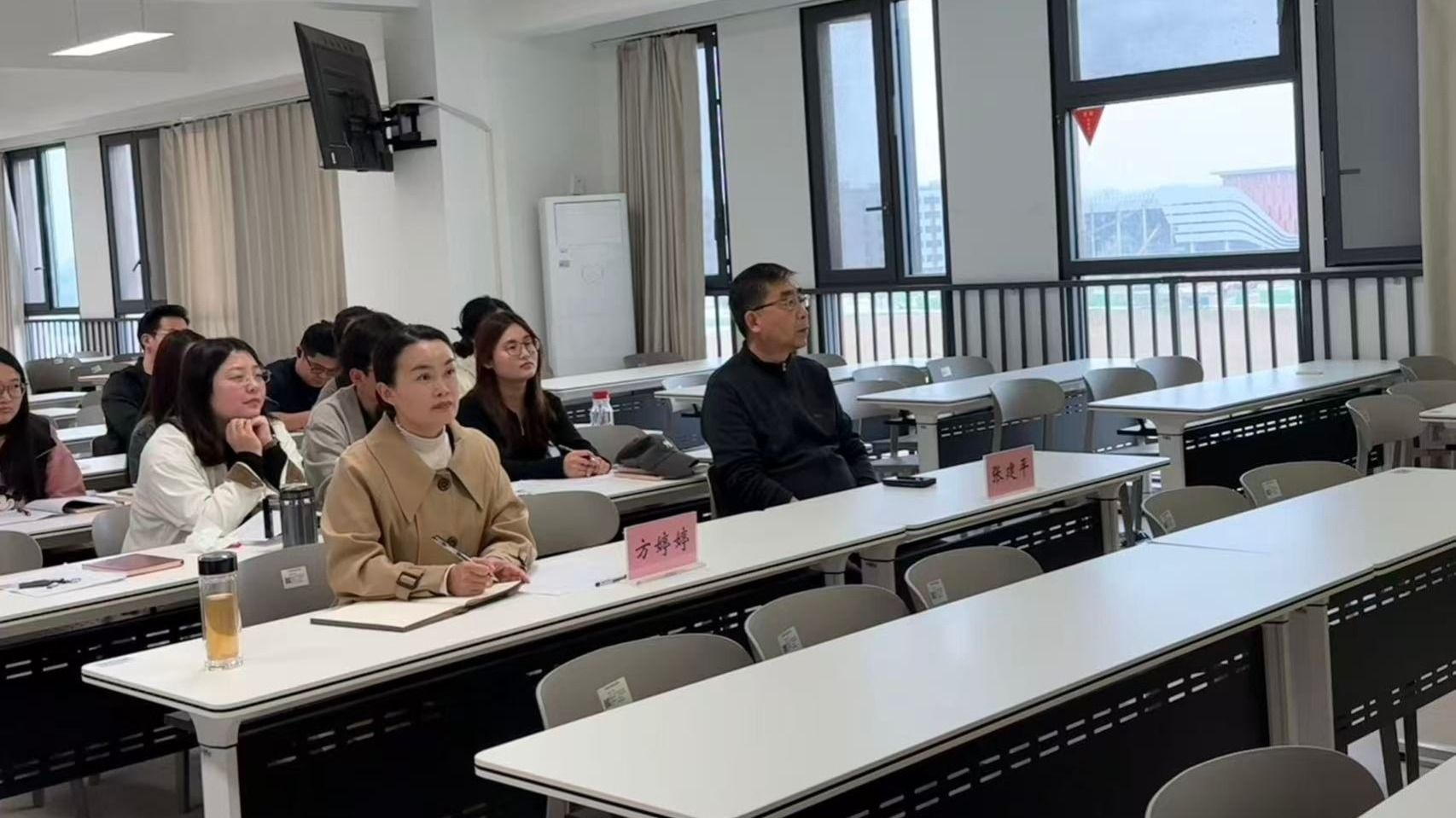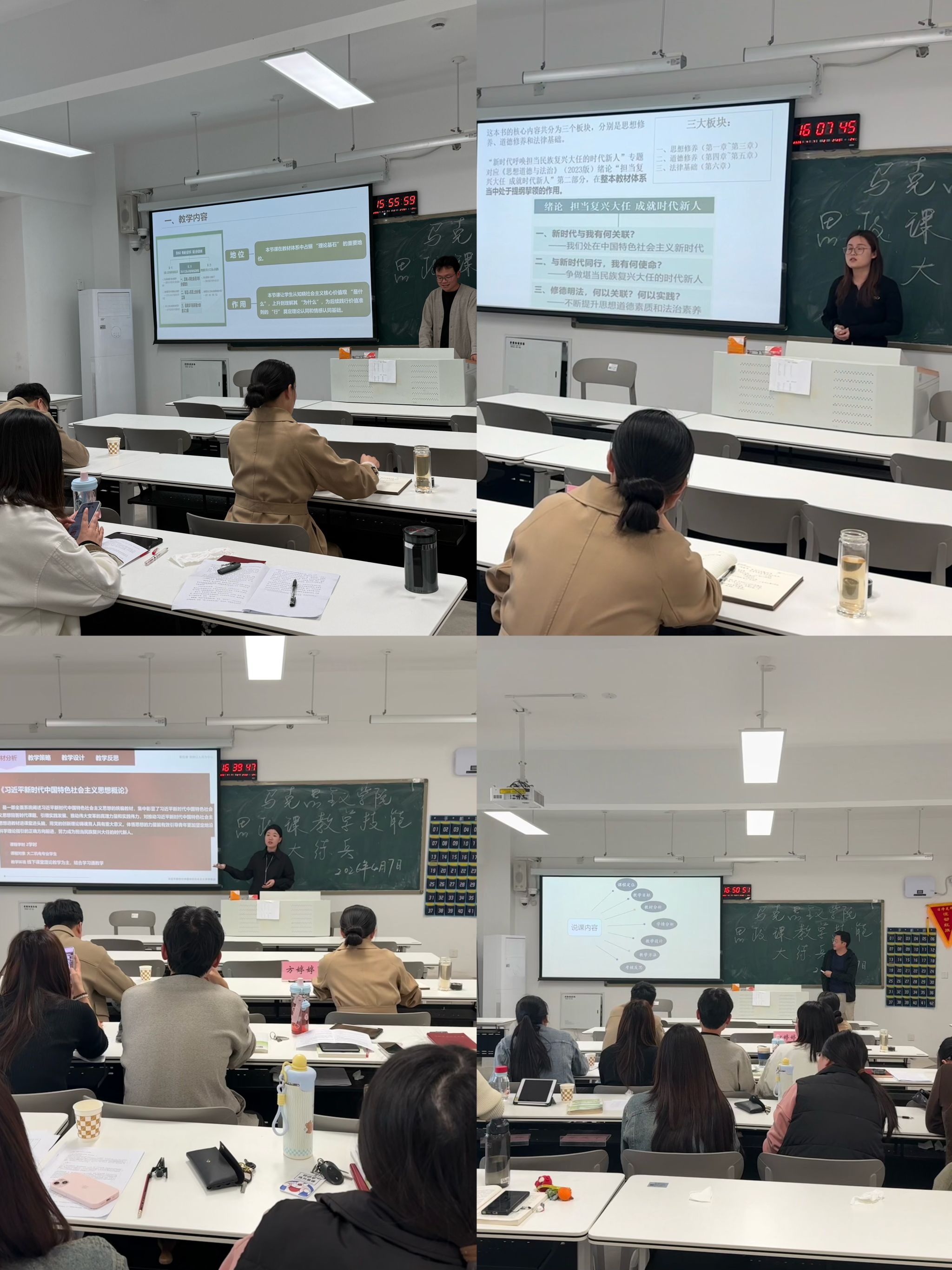 为深入贯彻落实立德树人根本任务,深化新时代思想政治理论课改革创新,全面提升思政课教师教学能力与专业素养。4月8日,马克思主义学院在2号楼407教室举办2026年度思政课教学技能“大练兵”活动。院长方婷婷出席活动,并特邀教务处张建平处长担任评委。全院共12位思政课教师同台竞技,展风采、强技能,以赛促教、以赛促研、以赛促改,共同探索交流新时代思政课高质量发展新路径。