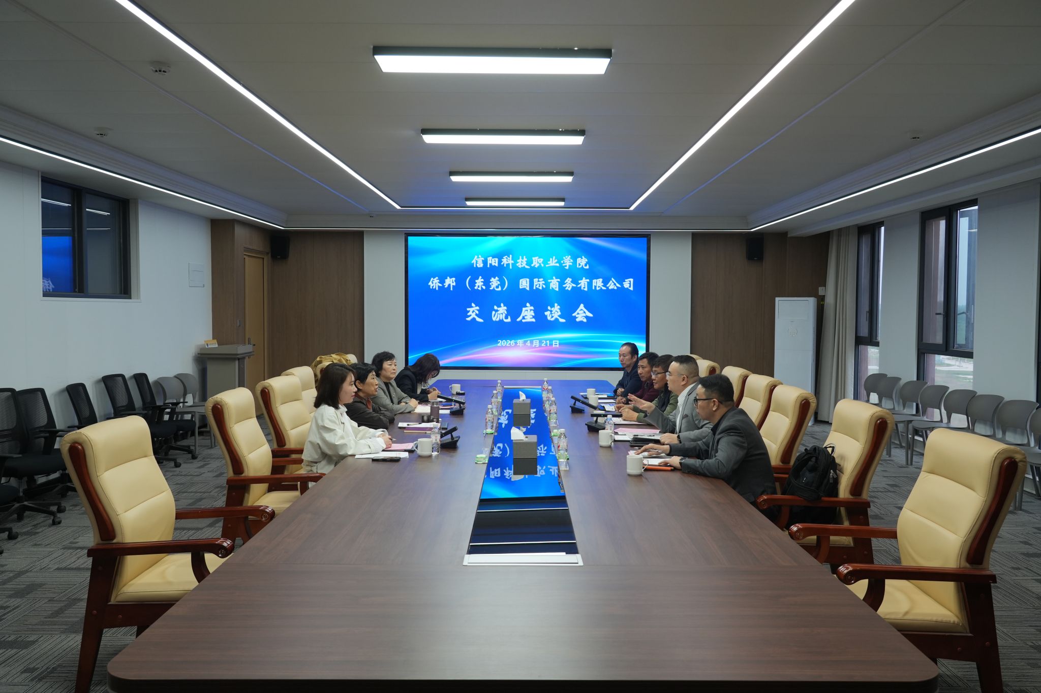4月21日,侨邦国际商务有限公司、澳大利亚GSS教育集团代表一行到我校访问交流。双方在2号教学楼613会议室举行座谈会,就澳大利亚国际合作办学项目达成深度合作意向。这标志着我校在拓展对澳合作、打通学生海外高质量就业通道方面取得重要突破。