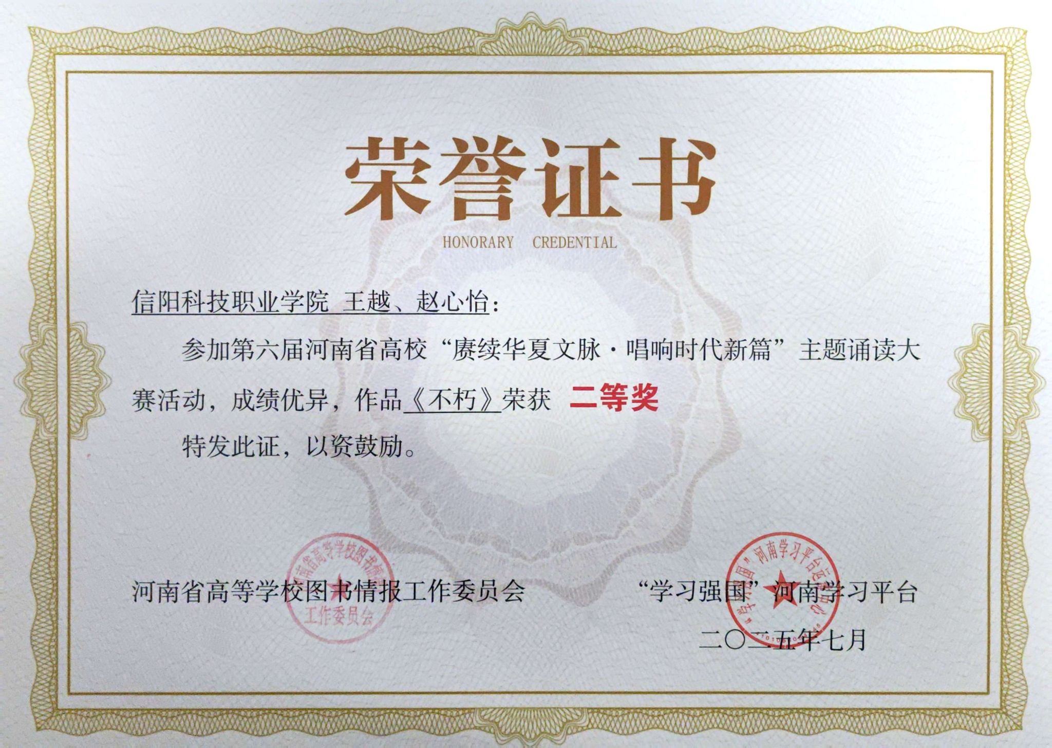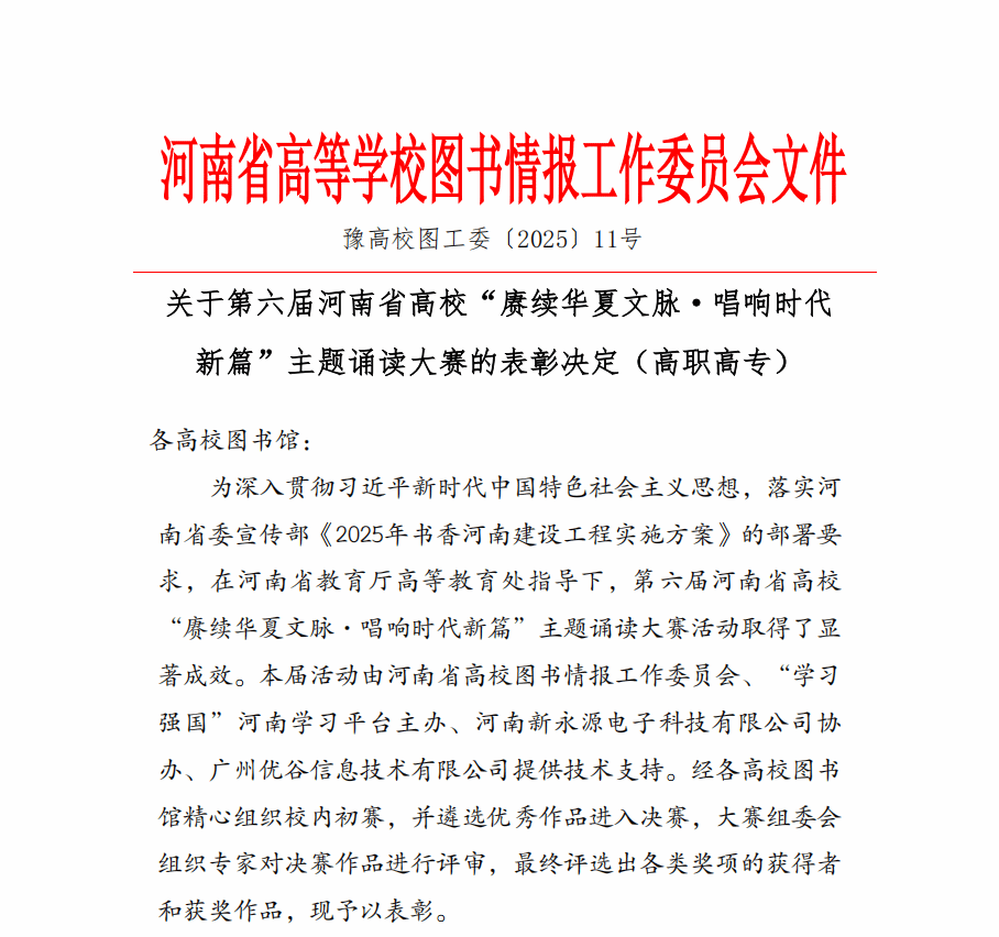 近日,从第六届河南省高校“赓续华夏文脉·唱响时代新篇”主题诵读大赛评审现场传来喜讯,我校师生凭借出色表现斩获二等奖,为学校争得了荣誉。