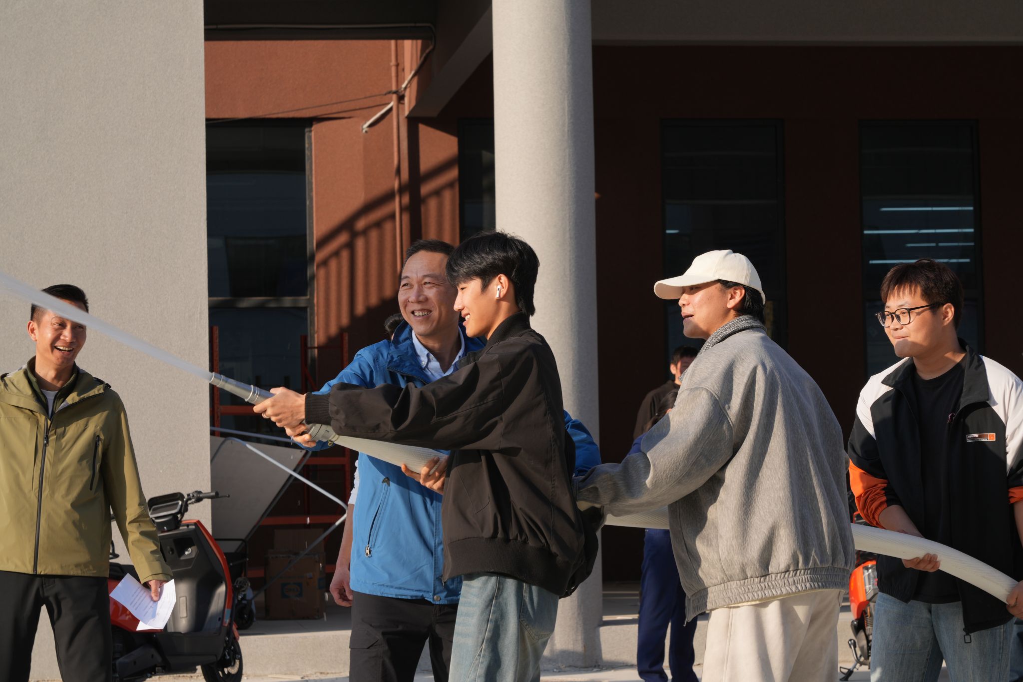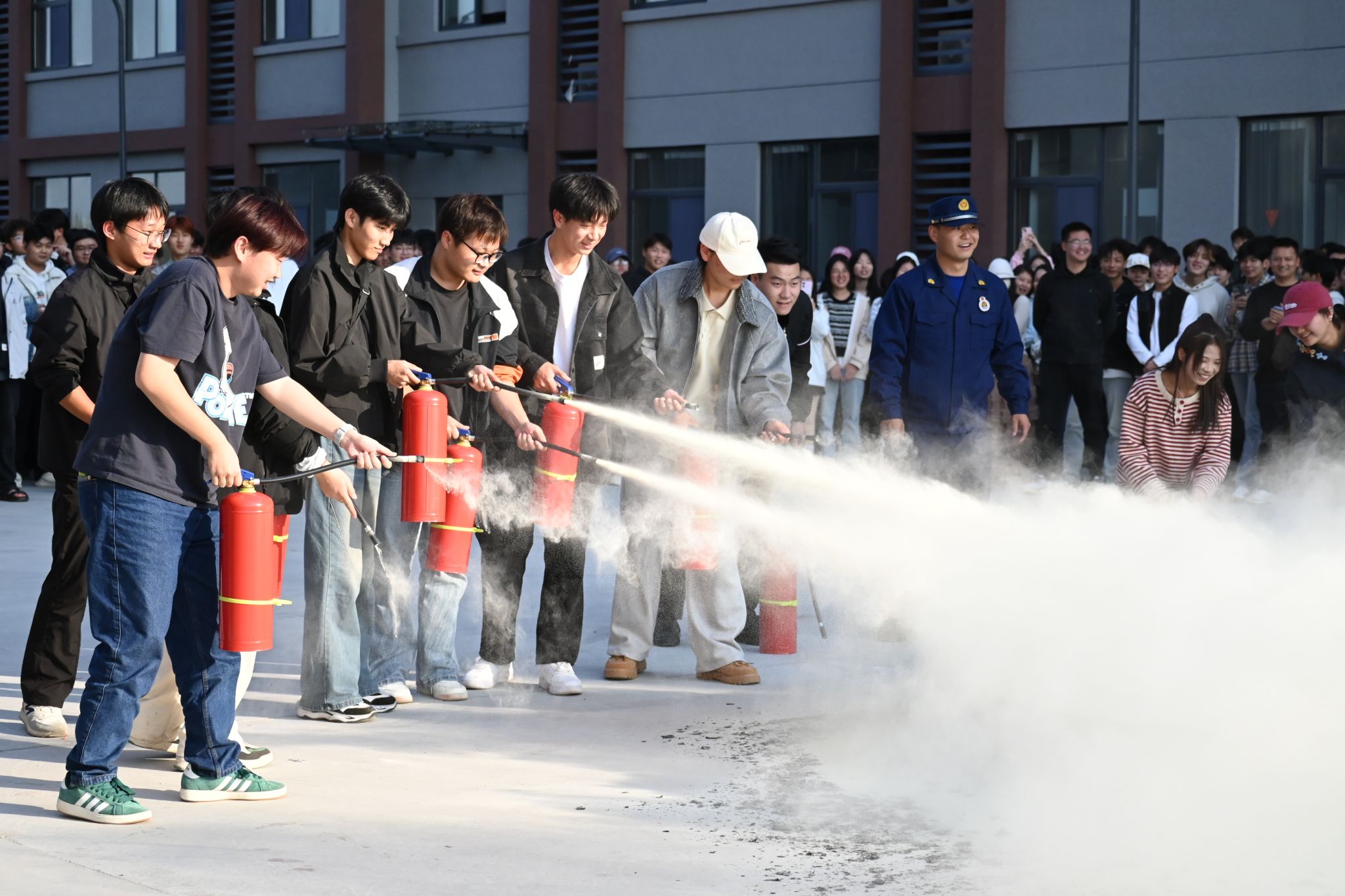 疏散完成后,进入消防器材实操学习环节。消防救援大队专业人员现场示范灭火器、消防栓等常见器材的正确用法。师生们踊跃参与实操,在消防队员指导下,亲自操作灭火器扑灭模拟火源,参与消防栓实操的师生也认真按步骤连接水带、打开阀门,力求每个环节精准无误。此次实操学习切实提升了师生的消防实践技能,增强了应对火灾的信心与能力。