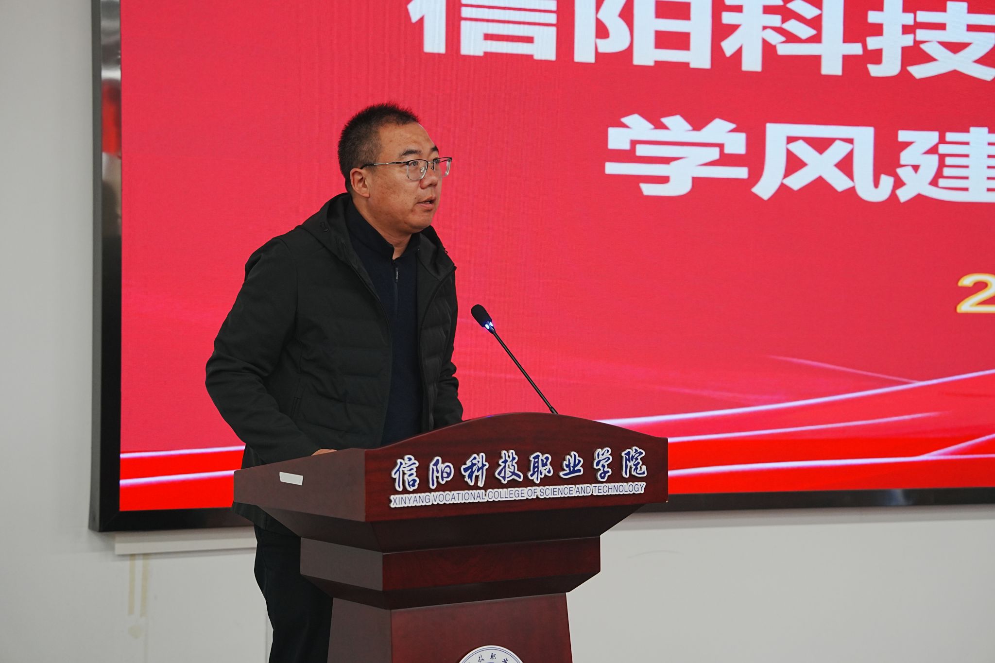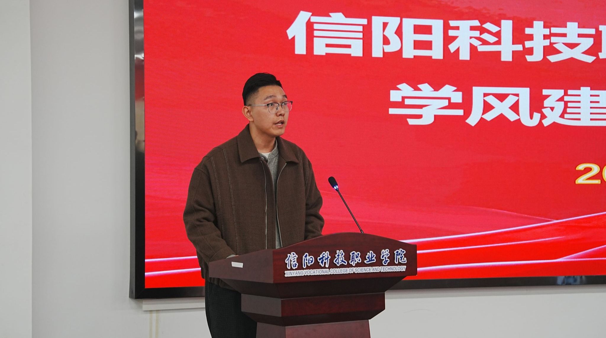 学生处牛帅宣读了《信阳科技职业学院关于开展2025年度学风建设月活动的通知》,明确了本次活动月的主题,强调了活动月的总体要求、主要活动安排及预期目标。文件强调,要通过一系列内容丰富、形式多样的教育活动、榜样引领及学风督查等,引导广大学生端正学习态度,明确学习目标,营造勤奋刻苦、严谨求实、勇于探索的良好学习氛围。会上,学生代表、人工智能学院袁坤发言,他结合自身的学习经历和体会,表达了优良学风对于个人成长成才和学校发展的重要意义,并代表全体学生郑重承诺。教师代表、智能制造学院张文婷老师发言,她号召全体辅导员要以身作则,严谨治学,潜心育人,不断提升管理方法,争做“四有”好老师,以高尚的师德师风和精湛的业务能力引领学风建设。