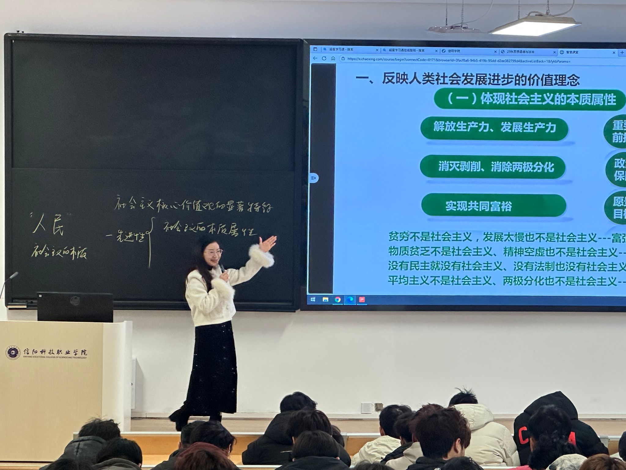 在阐释社会主义核心价值观体现“人类社会发展进步的价值理念”时,张老师从“社会主义本质属性”“中华优秀传统文化根基”“世界文明有益成果”三个维度展开,既梳理历史脉络,又融入春晚非遗展示、信阳茶文化节等贴近生活的案例,使理论讲解兼具思想深度与时代气息。在讲解“人民至上的价值立场”时,她以四川凉山公益绿皮慢火车为例,生动展现党和国家以人民为中心的发展理念,将抽象的理论转化为具体且充满温情的课堂叙事,让学生深刻体会到“人民对美好生活的向往就是我们的奋斗目标”并非抽象口号。