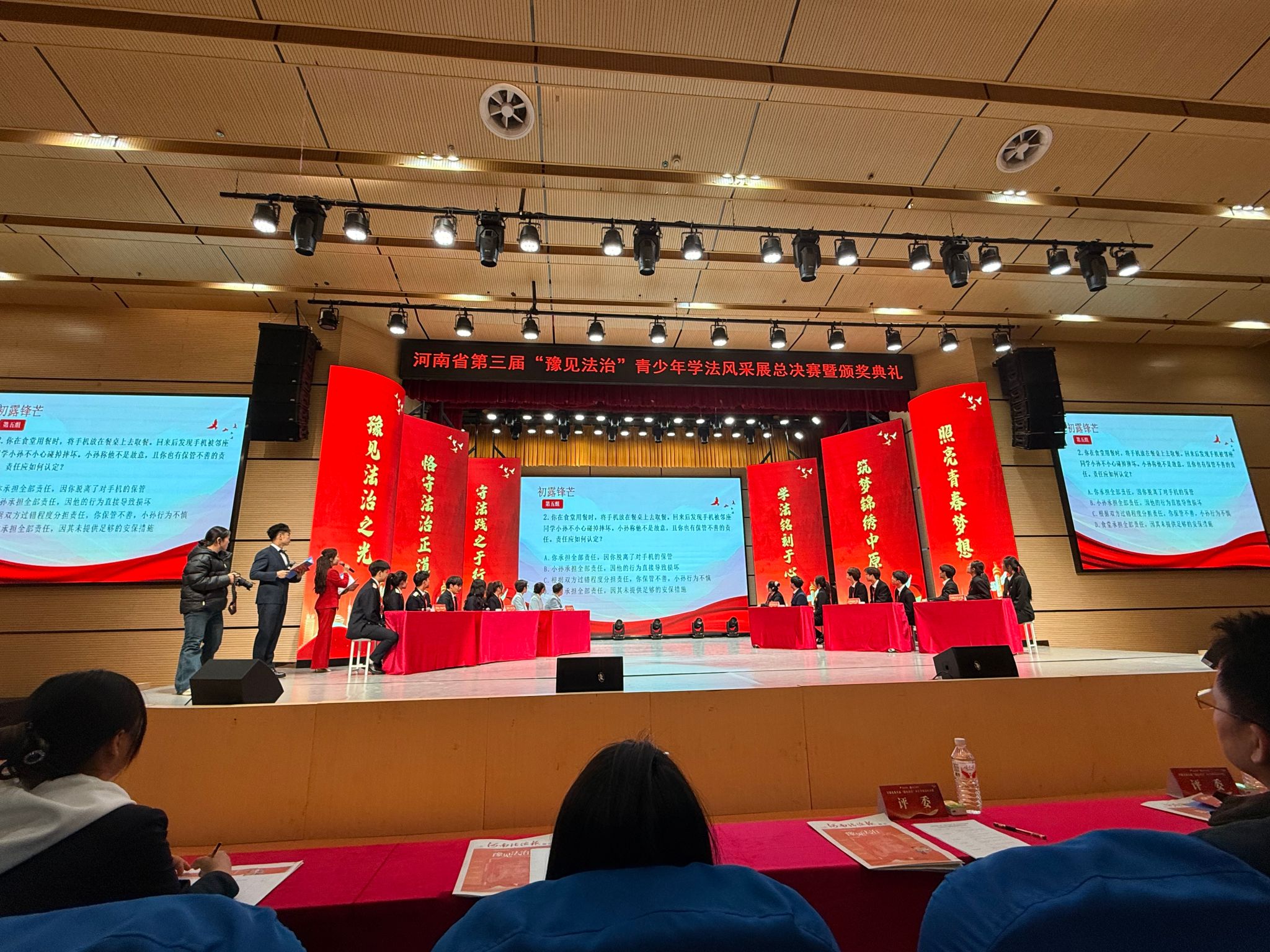 本届“豫见法治”青少年学法风采展以“法治河南・平安校园”为核心主题,自11月26日此次活动网络竞赛开展以来,学校高度重视,校团委积极动员、精心组织,教育引导广大学生加强法治知识学习,在全校掀起了学习法治知识的热潮,营造了全员学法、守法、用法的良好氛围。赛事分为网络答题初赛和现场决赛两个阶段,总决赛聚焦“巩固网络答题成效、展现高校学法成果”目标,设置大学组法律知识竞答、中学组法治主题演讲两大板块,竞赛内容融入生态环境保护法治知识,推动习近平法治思想与生态文明思想融入青少年教育,扩大普法覆盖面与影响力。