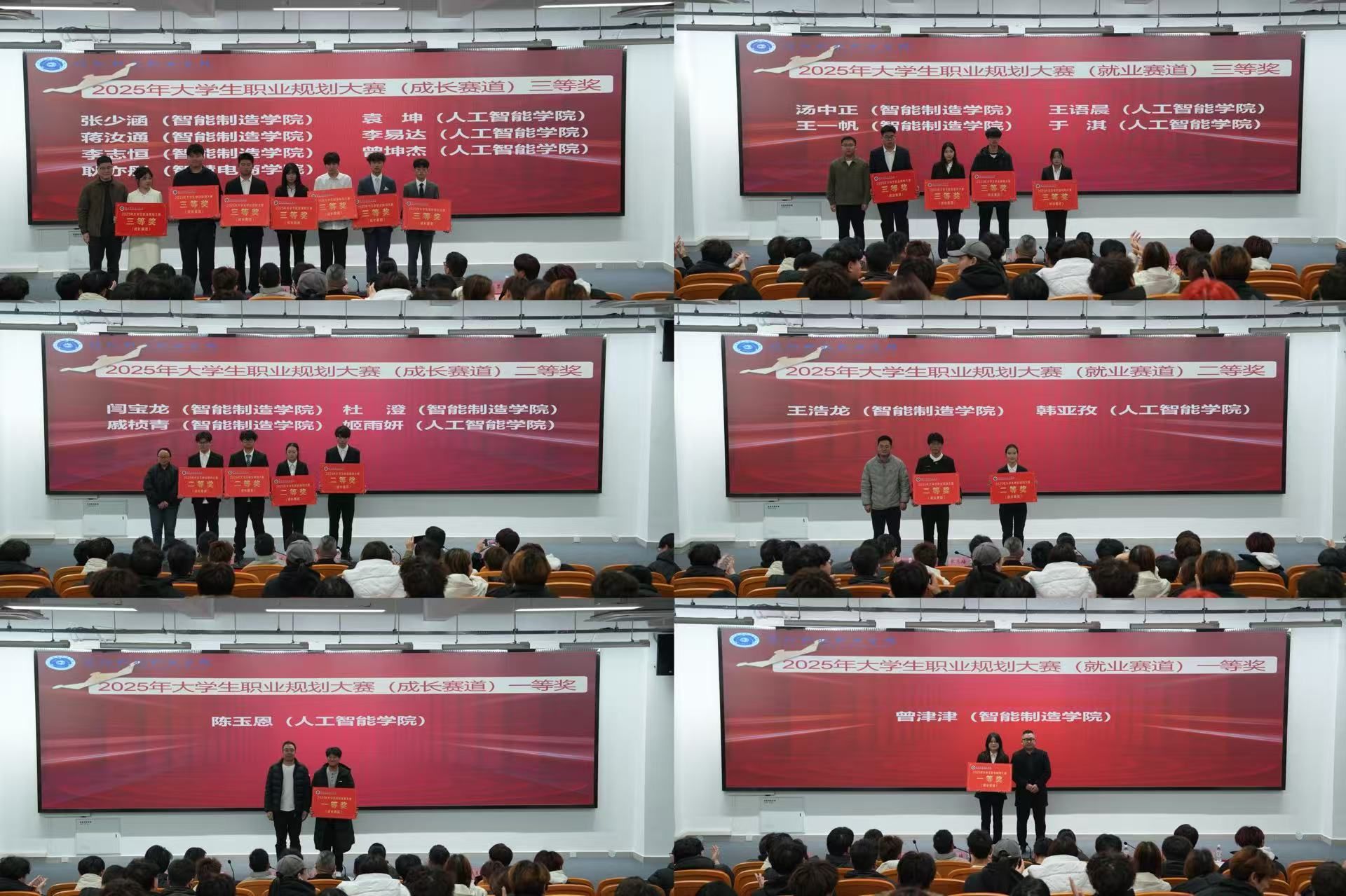 经过激烈角逐,人工智能学院陈玉恩获得成长赛道一等奖、智能制造学院曾津津获得就业赛道一等奖;智能制造学院戚桢青、智能制造学院杜澄、智能制造学院闫宝龙、人工智能学院姬雨妍、智能制造学院王浩龙、人工智能学院韩亚孜6 位同学获得二等奖;人工智能学院袁坤等 11 位同学获得三等奖;潘小雨等 17 位指导教师荣获优秀指导教师奖;智能制造学院获得优秀组织奖。