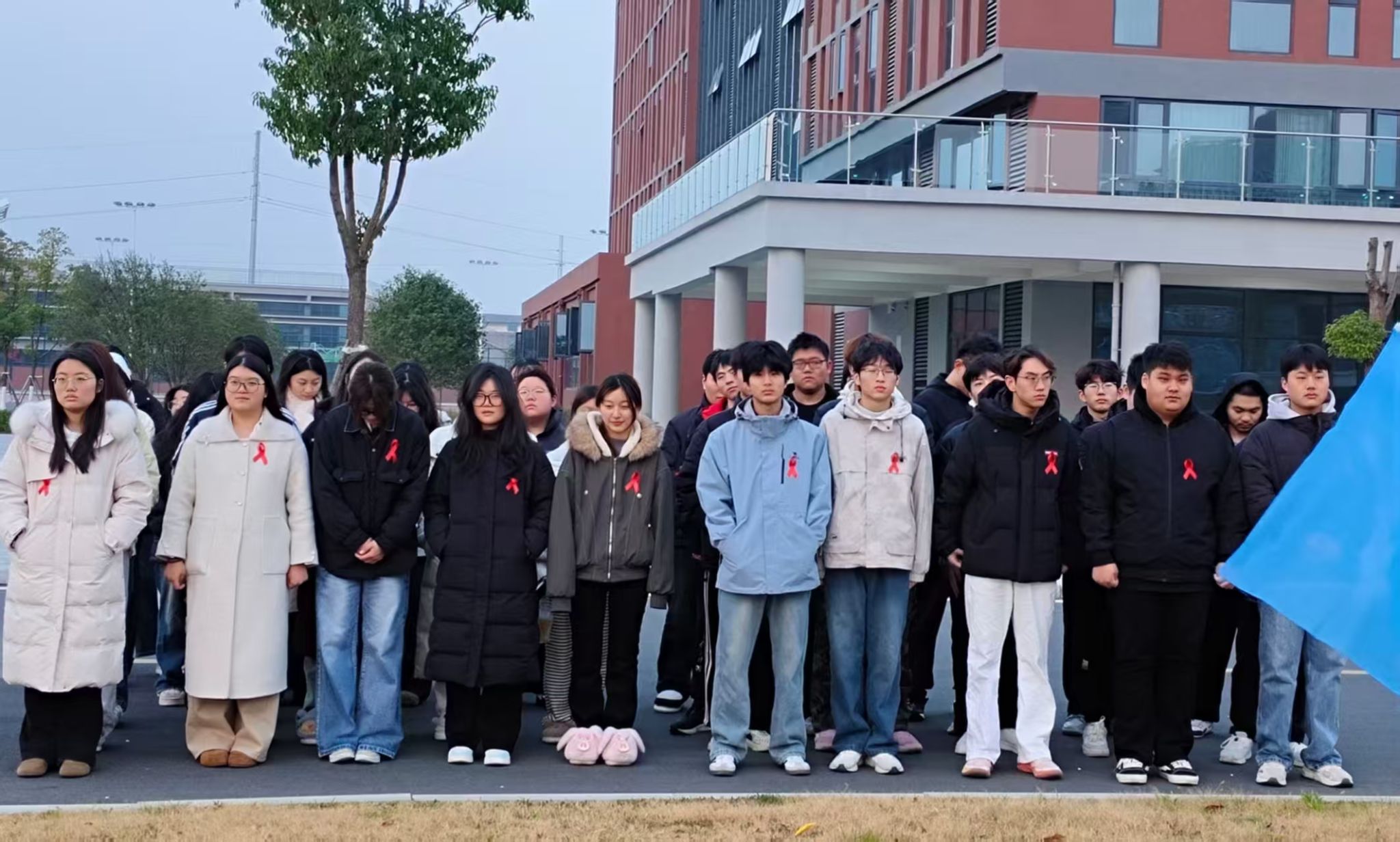 12月1日清晨,在凛冽而清新的冬日空气中,我校智慧电商学院和数字创意与设计学院师生齐聚升旗广场,隆重举行第38个“世界艾滋病日”主题团日活动。与往日不同,本次活动现场涌现出一片温暖的“红色海洋”——每一位师生的胸前都整齐地佩戴着一条鲜艳的红丝带,成为此次活动中最动人、最鲜明的符号。