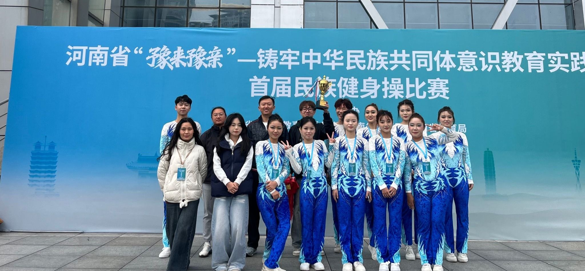 近日,在刚刚落幕的“豫来豫亲”--铸牢中华民族共同体意识教育实践活动首届民族健身操比赛中,由我校罗贺、曾欢欢、杨东老师担任教练,裴振翔老师担任领队,李欣桐、陈雅静等十一名同学组成的代表队团结拼搏,最终荣获三等奖。