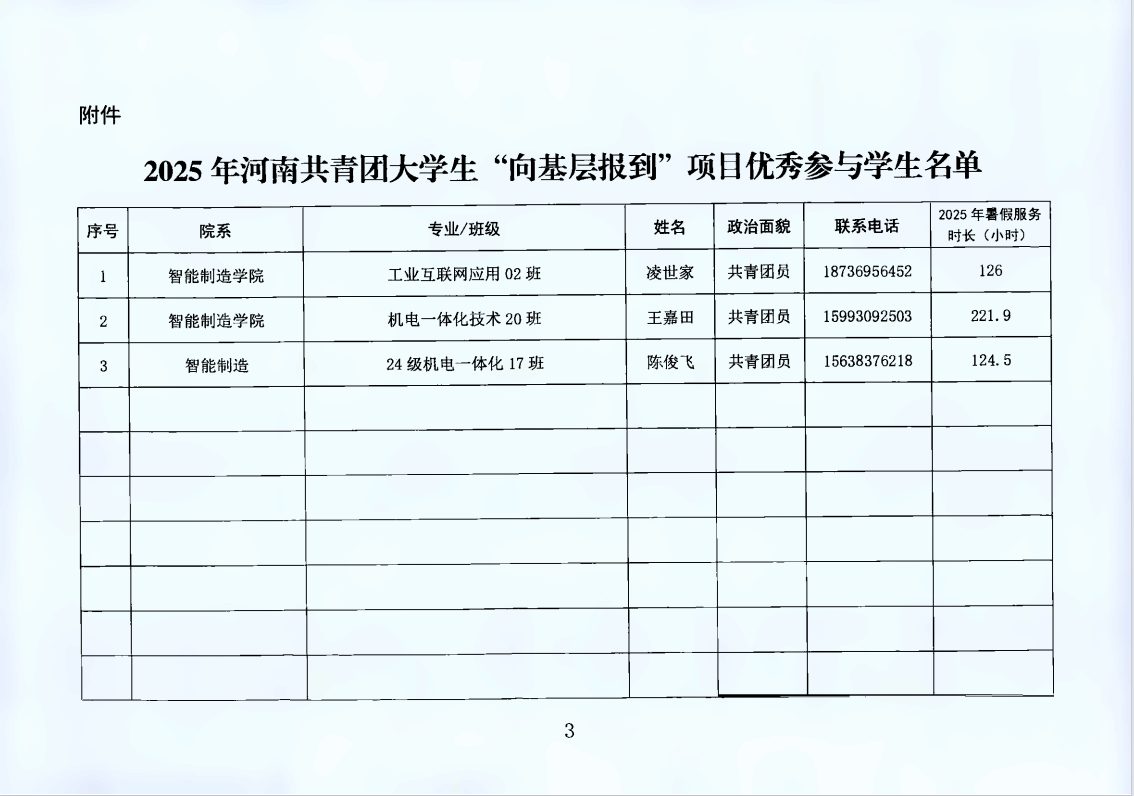 2025年暑假期间,我校千余名学生投身于暑期社会实践,其中3名同学积极参加2025年河南省共青团大学生“向基层报到”项目,以卓越表现获团河南省委表彰;237名在校生在阳光招生宣传活动中发挥重要作用,他们不仅参与线上直播招生,还积极开展线下“返家乡”招生宣传,通过“手拉手”招生帮扶,覆盖全省18地市,形成“线上+线下”联动的高效宣传模式。