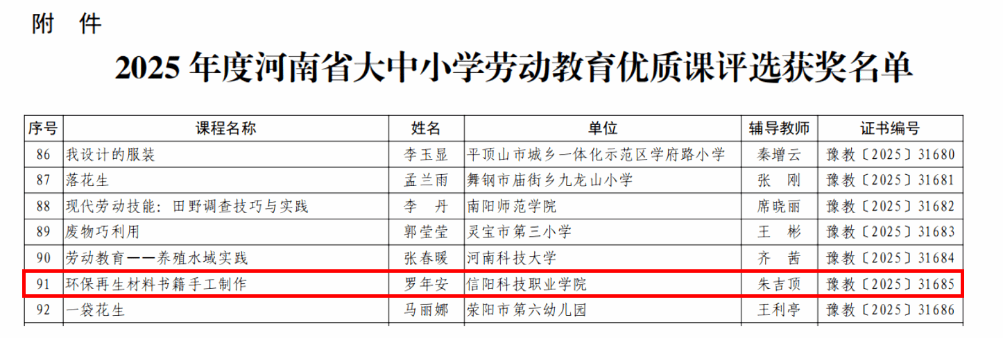 近日,河南省教育厅公布了2025年度全省大中小学劳动教育优质课评选结果,我校教师罗年安凭借课程《环保再生材料书籍手工制作》,在劳动教育学科融合优质课赛项中荣获省级二等奖。