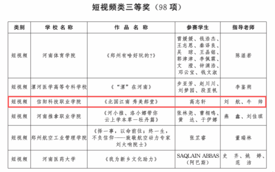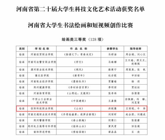 2025年10月17日,中共河南省委宣传部、共青团河南省委、河南省教育厅等七部门联合印发《关于公布河南省第二十届大学生科技文化艺术活动结果的通知》(豫青联字〔2025〕21号),我校学子在本次省级赛事中斩获佳绩,24智能02 洪皖豫、23视传专02 高志轩两位同学分别在绘画类、短视频类比赛中荣获三等奖,充分展现了我校学子扎实的专业素养与昂扬的青春风采。