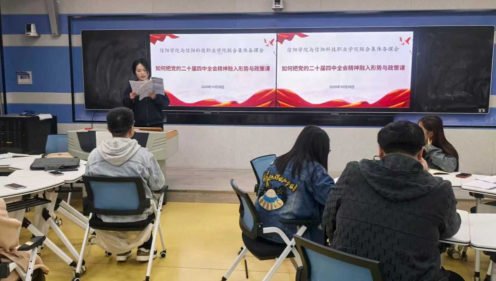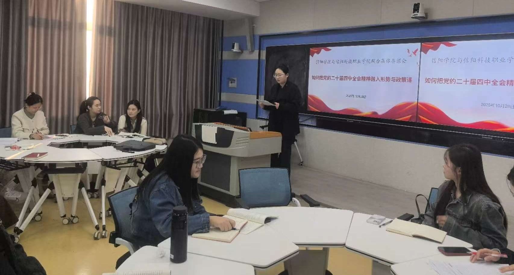 10月28日,我校马克思主义学院与信阳学院马克思主义学院联合举办了党的二十届四中全会精神专题学习研讨会。双方思政课教师代表围绕如何将全会精神有机融入“形势与政策”课教学展开了深入研讨,从教学目标设定、教学内容优化到案例教学、小组讨论等方法创新进行了充分交流,致力于将党的创新理论讲深、讲透、讲活,切实提升思政课的教学质量与育人实效。