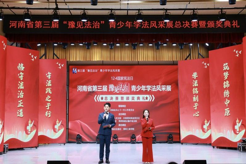 12 月 4 日,由河南省关心下一代工作委员会指导,河南省高级人民法院、共青团河南省委员会、河南日报社、郑州铁路运输中级法院联合主办,河南法治报社与郑州工商学院共同承办的第三届 “豫见法治” 青少年学法风采展总决赛暨颁奖典礼在郑州工商学院宇华讲堂圆满落幕。我校非法学专业学子赵锐帆、楚家保、曾坤杰组成的代表队凭借扎实的法治知识储备与出色的临场表现,荣获“非法学专业组二等奖”,指导老师王雨琨获评“优秀指导老师”称号,充分展现了信科学子尊法学法、笃行实干的青春风采。