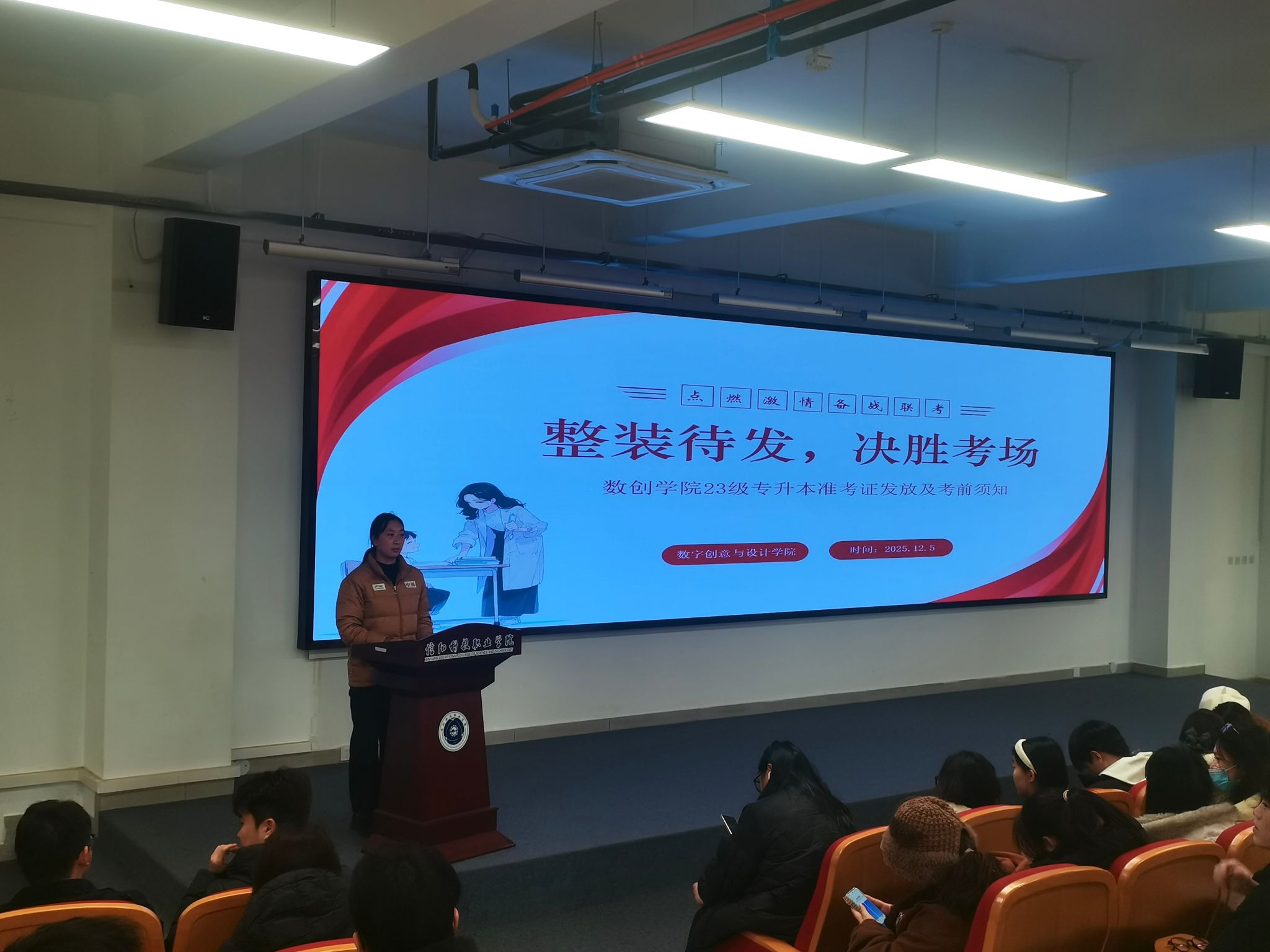 为扎实做好2025年普通高校专升本考试(艺术类批次)各项准备工作,切实保障考生顺利参考,12月5日下午,数字创意与设计学院组织全体报考学生集中开展专升本考前动员部署会,并同步完成准考证发放及《考生诚信考试承诺书》《专升本报考信息登记表》的填写工作。本次活动由学院辅导员统筹组织,旨在通过流程指导、材料规范与氛围营造,全方位护航学生升学之路。